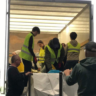 Pendant que nos chauffeurs se dépensent à charger les camions, d'autres bénévoles sont présents au Relais à Couëron pour faire le travail inverse et rentrer toutes ces chaussures dans d'énormes sacs appelés "curons". Des élèves du collège Saint Stanislas de Nantes étaient présents pour nous aider à cette tâche le lundi et d'autres du lycée Notre Dame de Rezé le mardi.