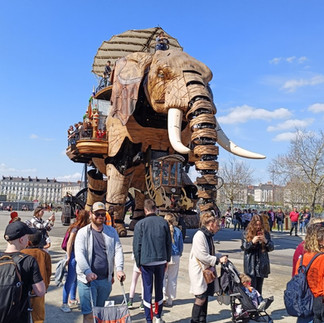 Nous sommes partis sous le soleil pour une balade le long de la Loire afin de rejoindre les machines de l'île. Petite pause en route aux jeux de "la cantine" et nous voilà devant l"éléphant qui vient vers nous d'un pas nonchalant arrosant deci delà les curieux venus l'admirer. Nous nous sommes installés dans la nacelle tout en haut et avons pu admirer les mécanismes complexes.